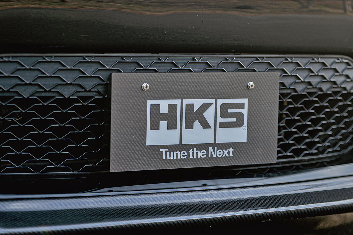 A license plate cover featuring a carbon-style print with a glowing HKS logo is now available.