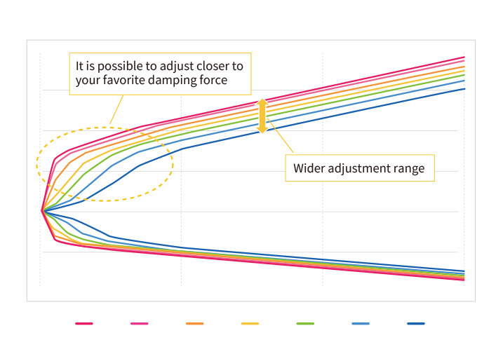 The shape of the damping adjustment needle has been redesigned to vary oil flow more effectively, incorporating an increased relief passage and a needle profile with a wider range of adjustment. By expanding the adjustment range toward the softer side, greater flexibility in soft-setting tuning is achieved. From a wide selection of needles with different characteristics, the optimal specification is selected for each vehicle. This enables highly adaptable suspension settings that perform consistently across a broad range of driving situations.