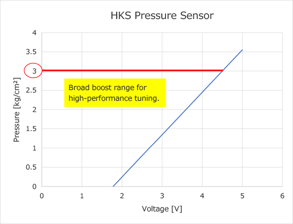 - The HKS Pressure Sensor Kit overcomes these limitations, providing accurate data tracking up to 294 kPa (3 kg/cm²). See Graph ② for details.