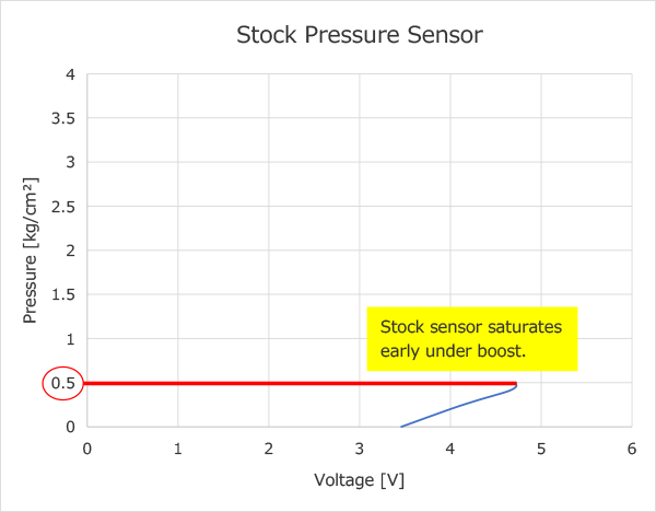 - Stock pressure sensors are designed for NA engines, so they have almost no positive pressure range and saturate early under boost.