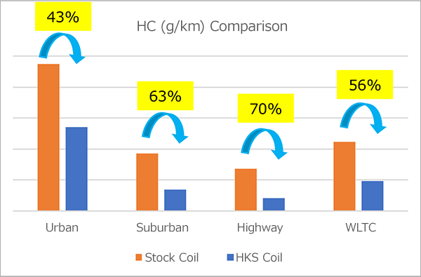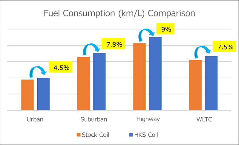 It has been confirmed that the SUPER FIRE RACING COIL PRO reduces CO and HC emissions under all test conditions. Fuel economy is also improved across all driving modes, with particularly noticeable benefits during high-speed driving such as highway cruising. These results indicate that the product has a positive effect on combustion efficiency, delivering not only improved high-RPM performance but also environmental benefits.