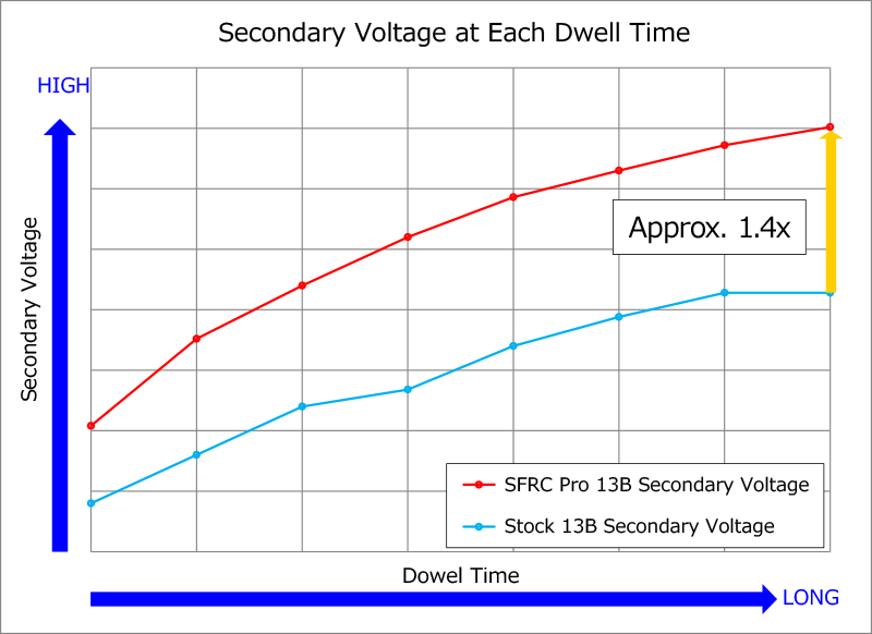 At maximum, it generates approx. 1.4 times higher secondary voltage compared to the stock system.