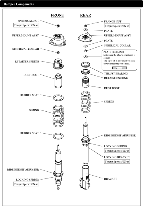 Damper oil leakage or any other problems caused by low ride height setting from the factory setting will void the warranty of the product.)
