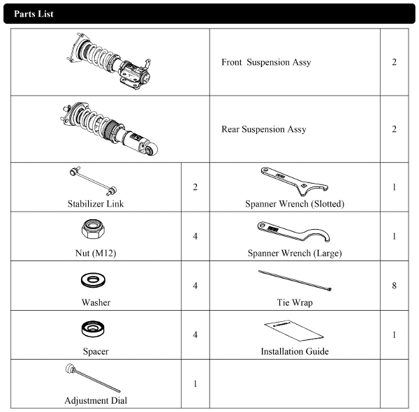 Damper oil leakage or any other problems caused by low ride height setting from the factory setting will void the warranty of the product.)