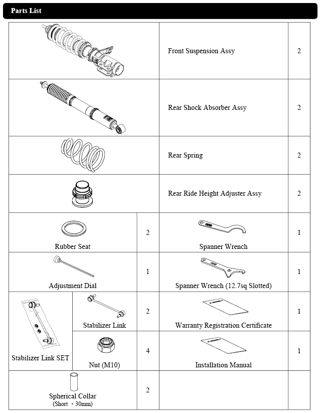 Damper oil leakage or any other problems caused by low ride height setting from the factory setting will void the warranty of the product.)