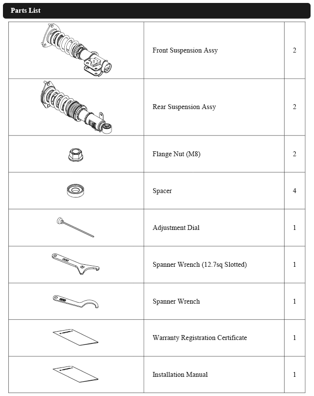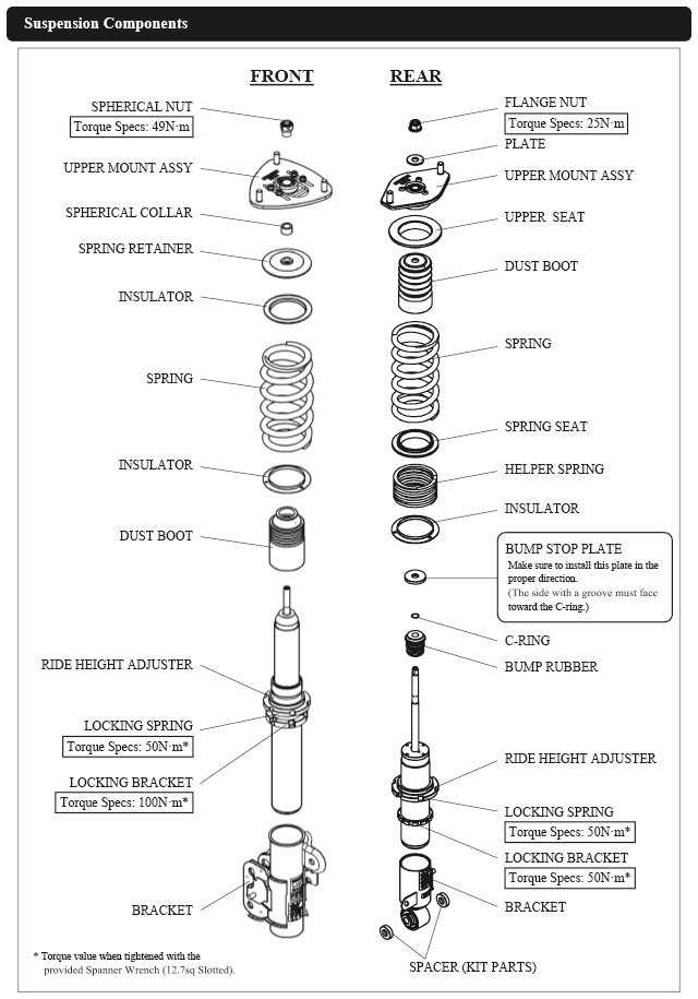 Damper oil leakage or any other problems caused by low ride height setting from the factory setting will void the warranty of the product.)