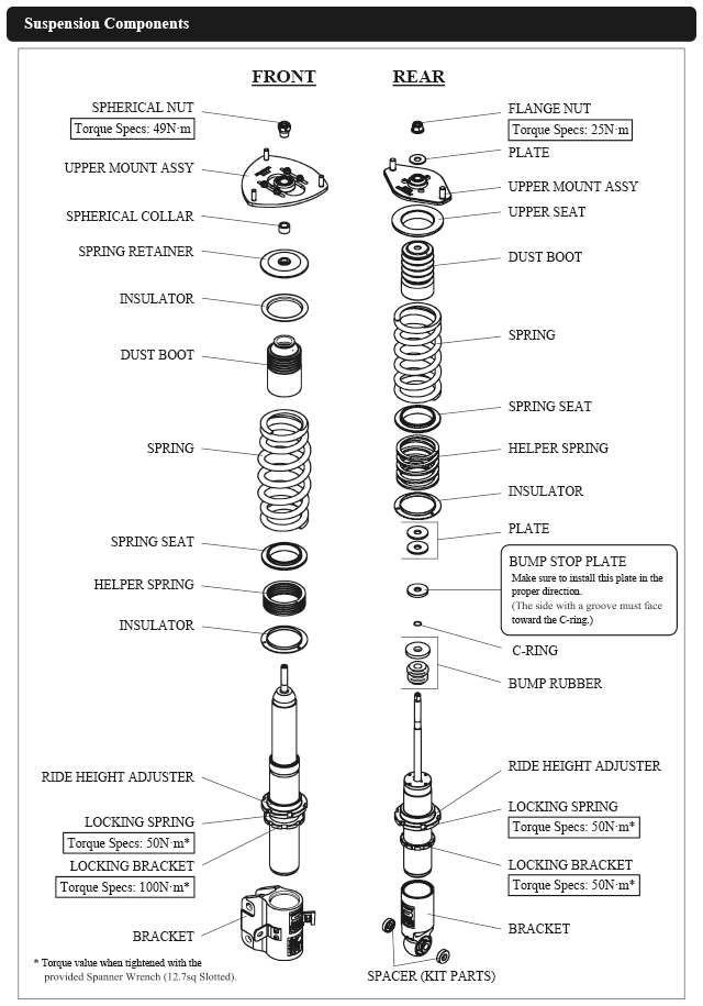 Damper oil leakage or any other problems caused by low ride height setting from the factory setting will void the warranty of the product.)