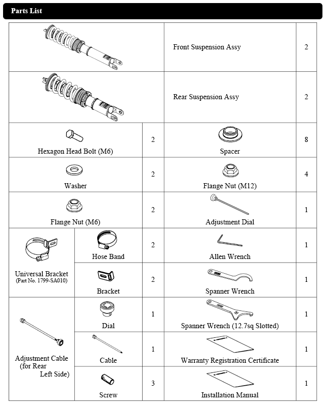 Damper oil leakage or any other problems caused by low ride height setting from the factory setting will void the warranty of the product.)