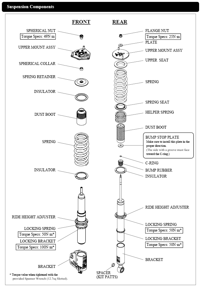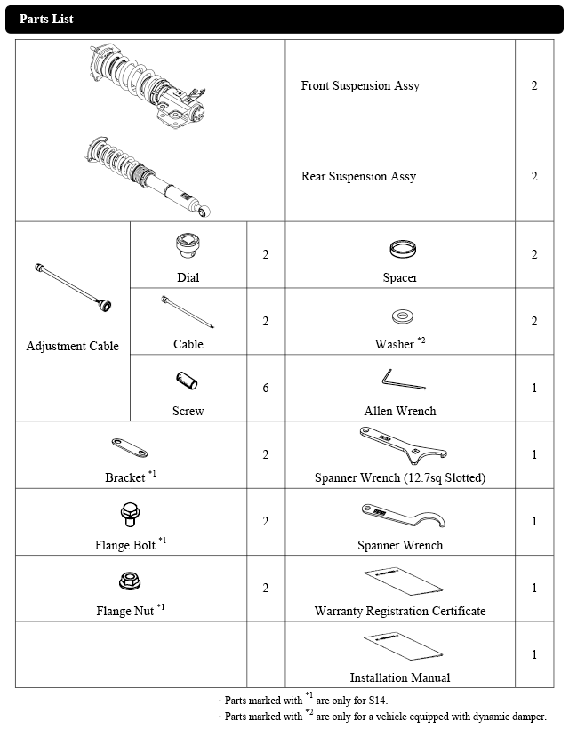 Damper oil leakage or any other problems caused by low ride height setting from the factory setting will void the warranty of the product.)