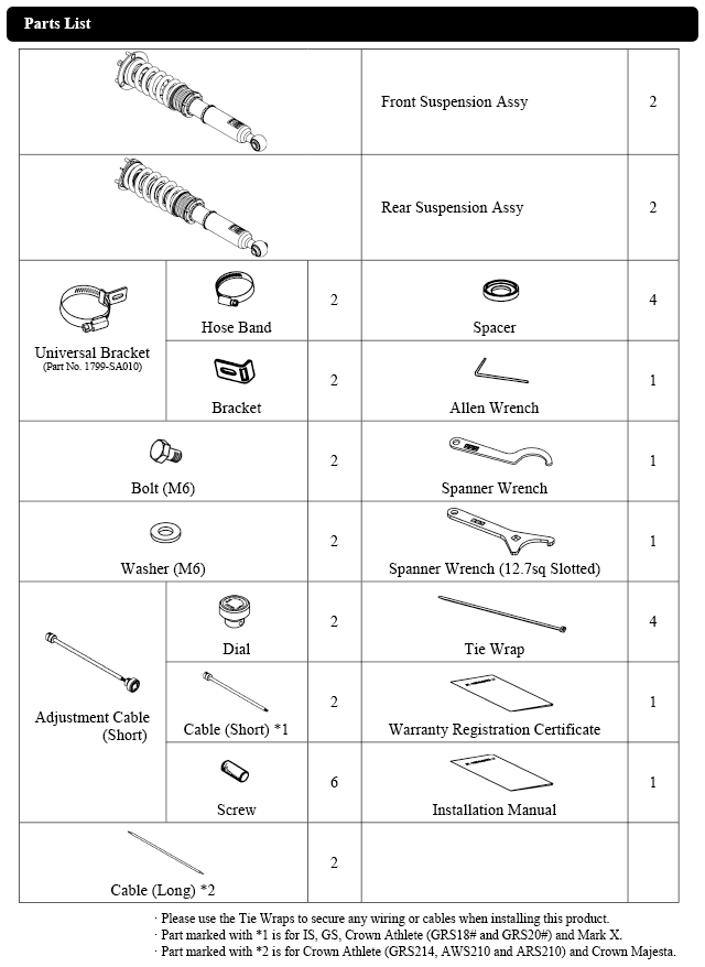Damper oil leakage or any other problems caused by low ride height setting from the factory setting will void the warranty of the product.)