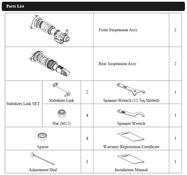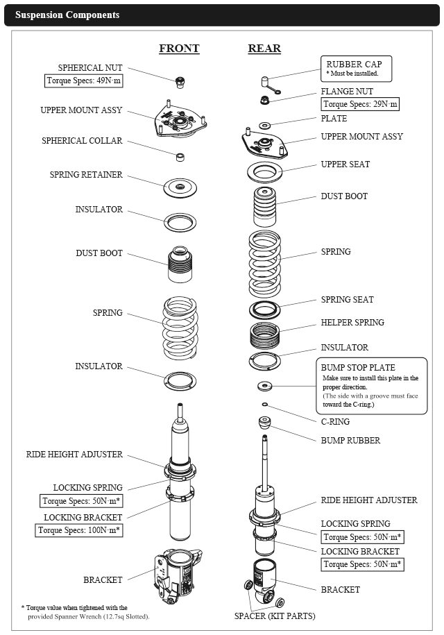 Damper oil leakage or any other problems caused by low ride height setting from the factory setting will void the warranty of the product.)
