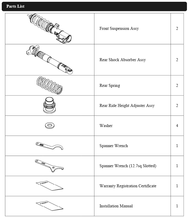 Damper oil leakage or any other problems caused by low ride height setting from the factory setting will void the warranty of the product.)