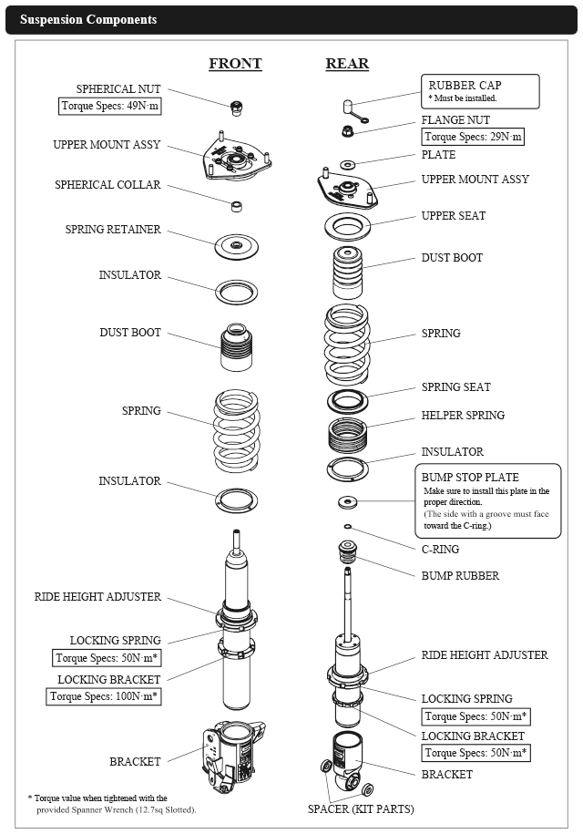 Damper oil leakage or any other problems caused by low ride height setting from the factory setting will void the warranty of the product.)