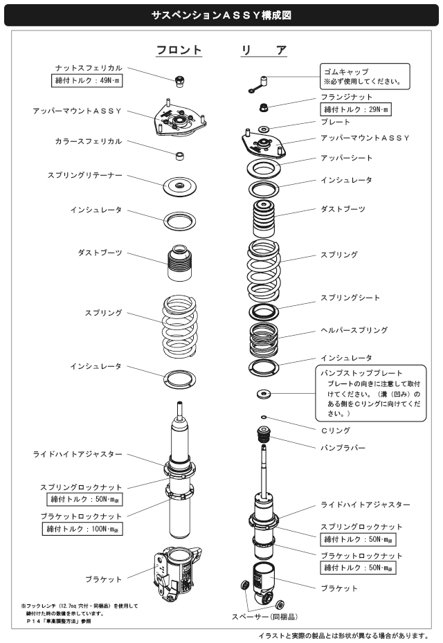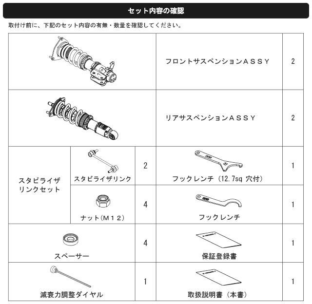Damper oil leakage or any other problems caused by low ride height setting from the factory setting will void the warranty of the product.)