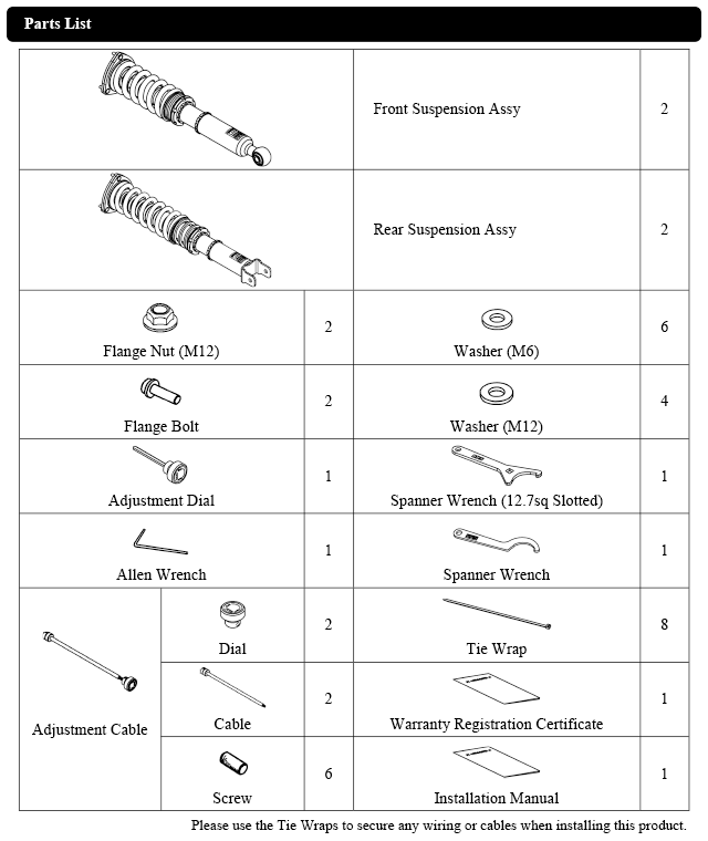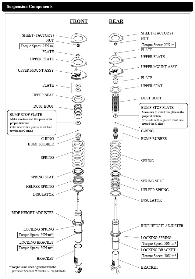 Damper oil leakage or any other problems caused by low ride height setting from the factory setting will void the warranty of the product.)