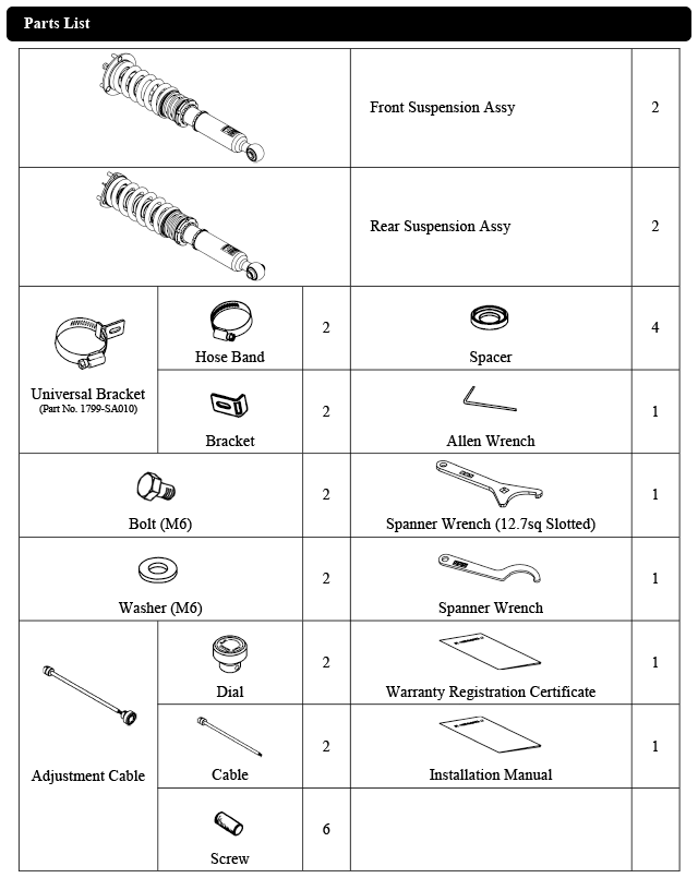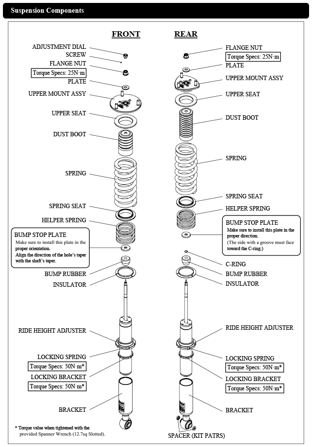 Damper oil leakage or any other problems caused by low ride height setting from the factory setting will void the warranty of the product.)