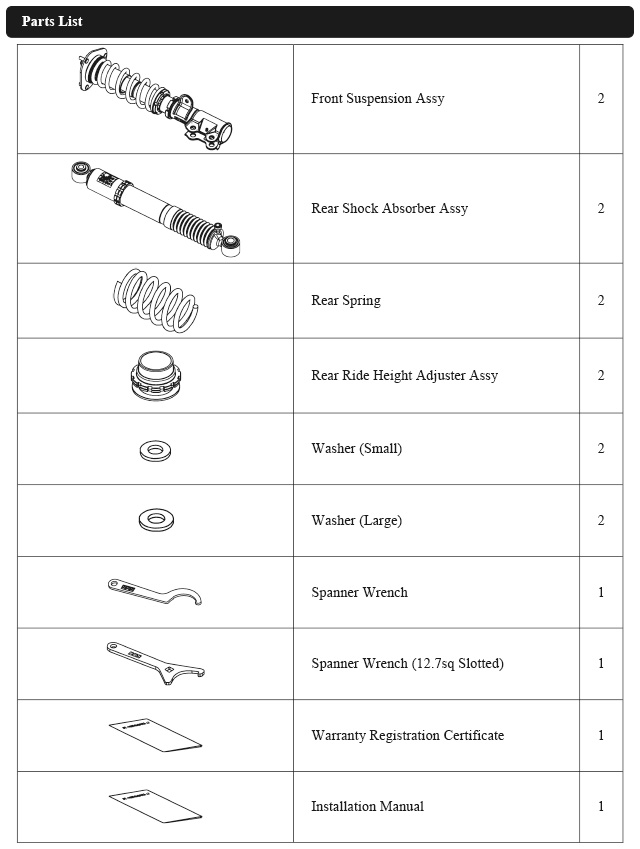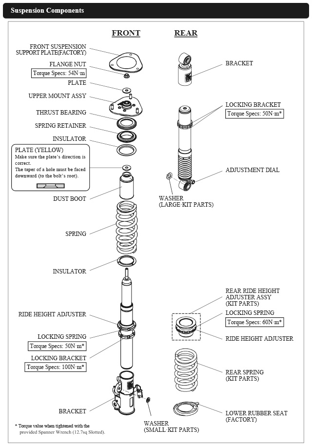 Damper oil leakage or any other problems caused by low ride height setting from the factory setting will void the warranty of the product.)