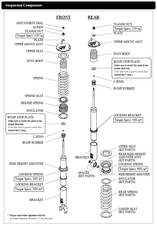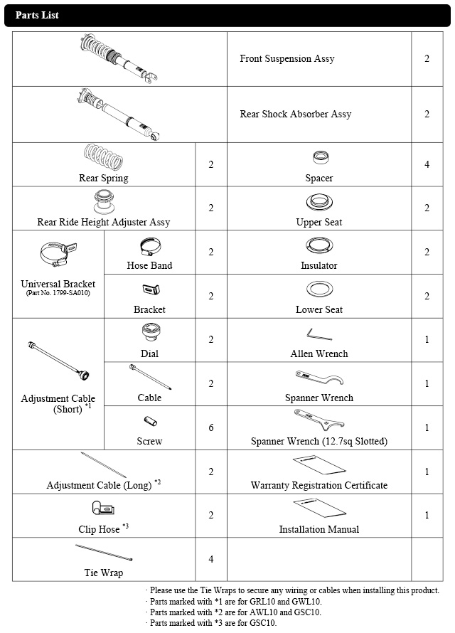 Damper oil leakage or any other problems caused by low ride height setting from the factory setting will void the warranty of the product.)