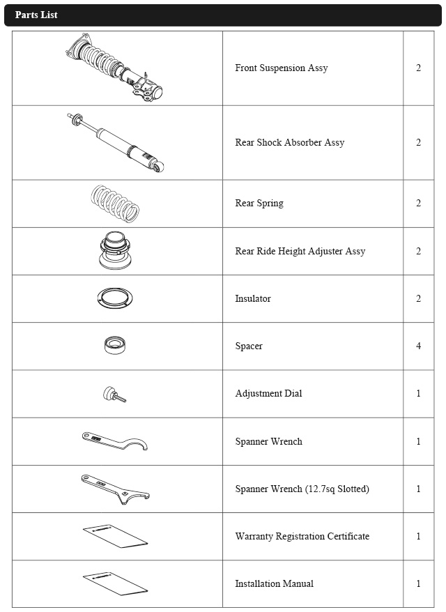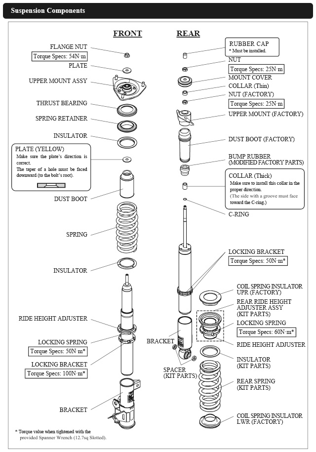 Damper oil leakage or any other problems caused by low ride height setting from the factory setting will void the warranty of the product.)