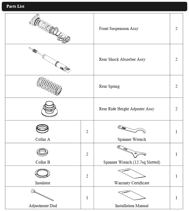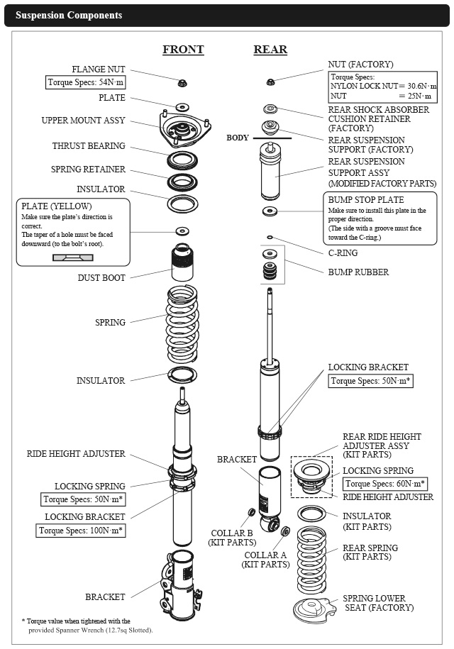 Damper oil leakage or any other problems caused by low ride height setting from the factory setting will void the warranty of the product.)