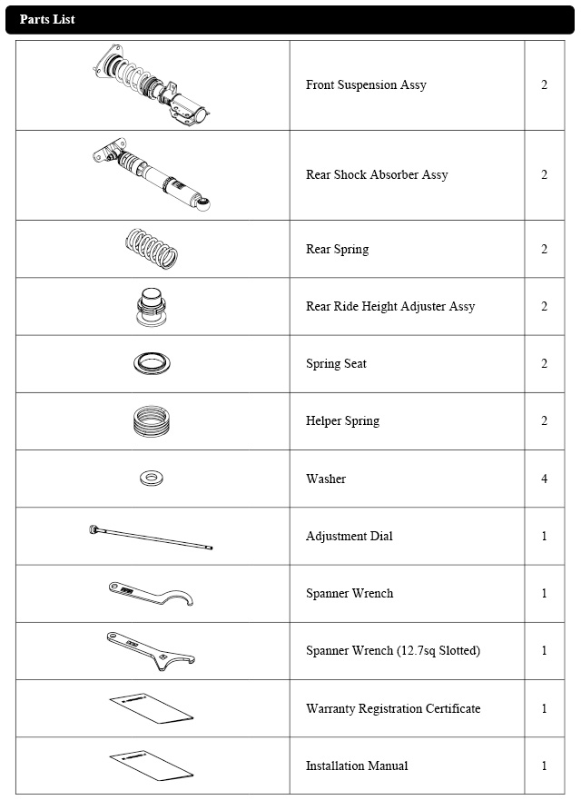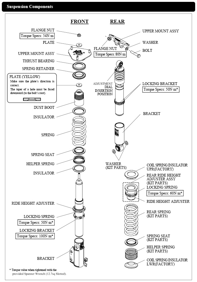 Damper oil leakage or any other problems caused by low ride height setting from the factory setting will void the warranty of the product.)