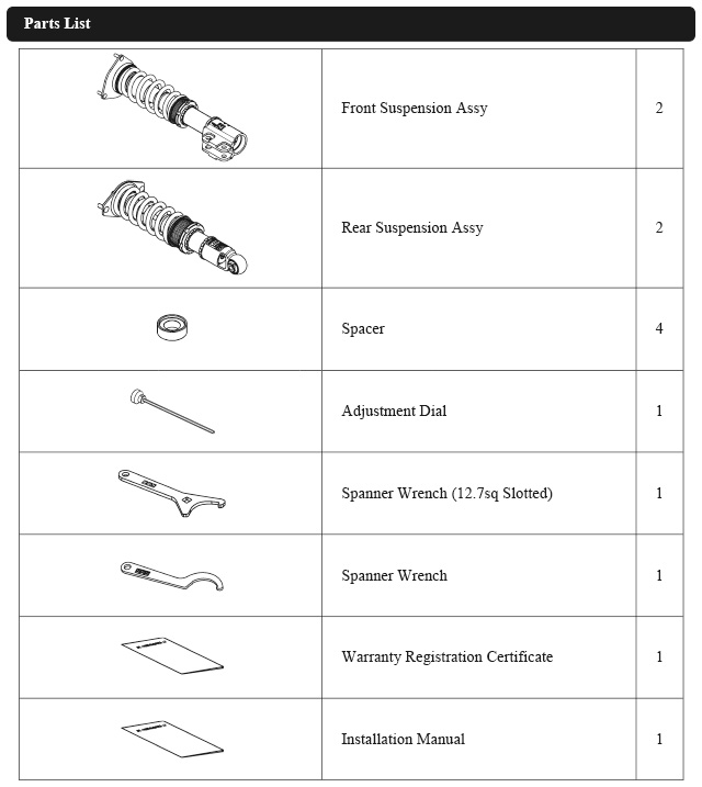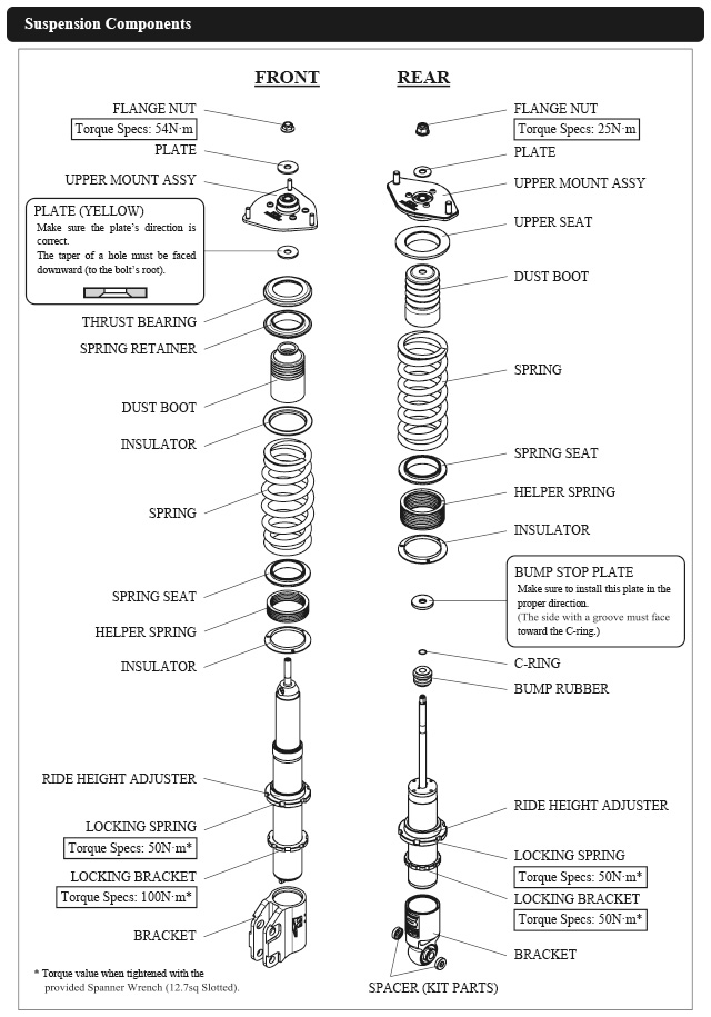 Damper oil leakage or any other problems caused by low ride height setting from the factory setting will void the warranty of the product.)