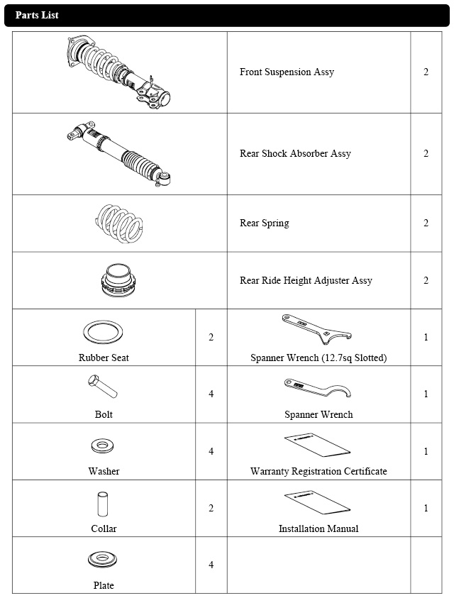 Damper oil leakage or any other problems caused by low ride height setting from the factory setting will void the warranty of the product.)
