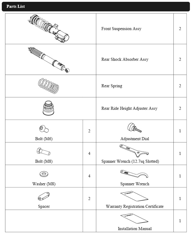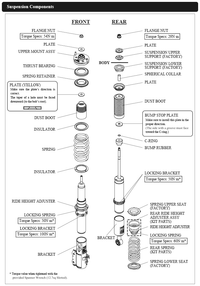 Damper oil leakage or any other problems caused by low ride height setting from the factory setting will void the warranty of the product.)