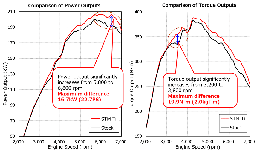 Compared to the stock exhaust with pipes diameter of 70mm ⇒ 60.5mm ⇒ 42.7mm x 2 and a separation wall structured silencer, this product achieves overwhelming exhaust performance by adopting pipes diameter of 74.7mm ⇒ 60.5mm x 2 and a straight structured silencer without restrictions.