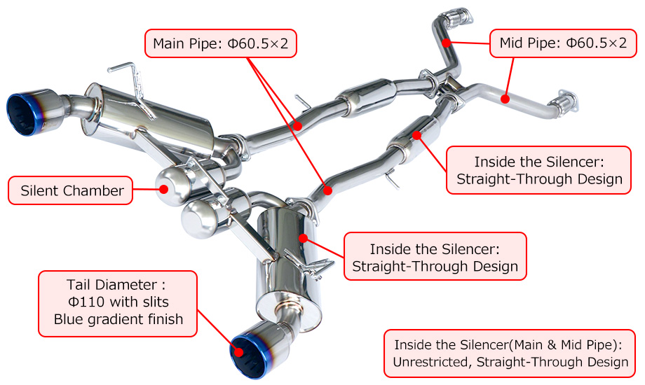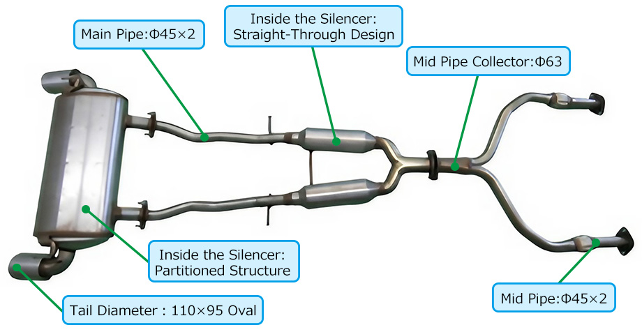 By securing a cross-sectional area equivalent to φ85, exhaust resistance is reduced by approximately 40% compared to stock system. This setup delivers smooth performance from daily driving to sporty driving.