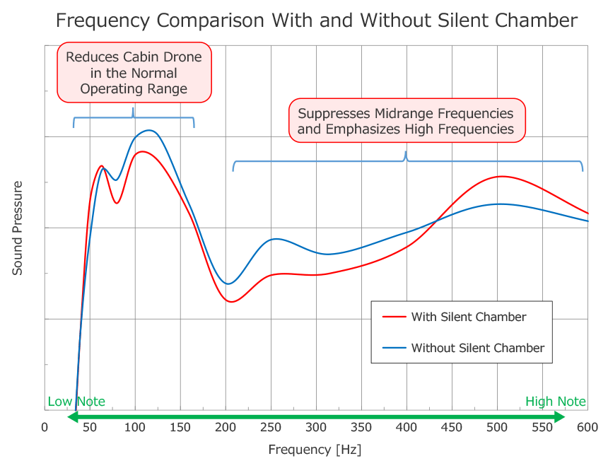 The silencer structure combined with a silent chamber suppresses unwanted cabin drone during steady cruising. The result is a sporty sound that blends the powerful character of a V6 engine with refined, high-quality acoustics.