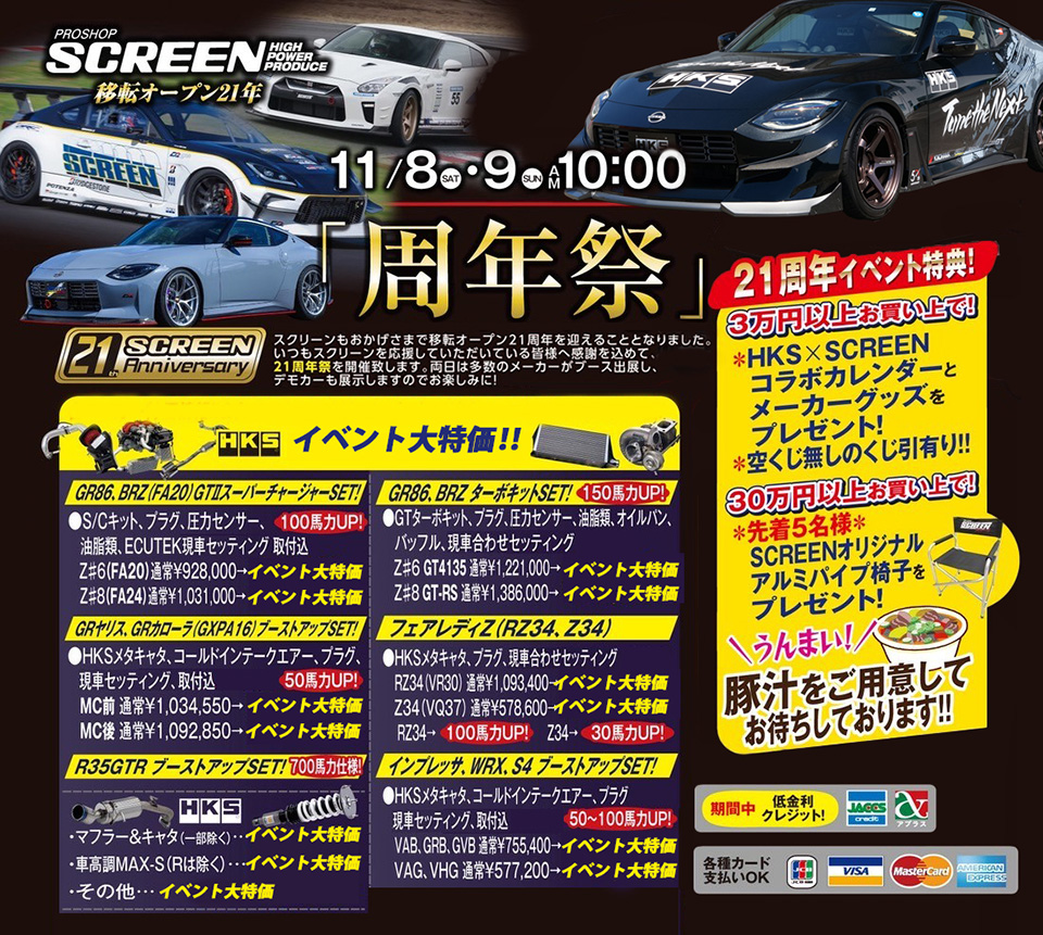 | イベント内容 | おかげさまで、移転オープン21周年が経ちました。 今年も感謝の気持ちを込めて21周年祭を開催致します。 イベント当日2日間は、HKSデモカーRZ34を展示! また、イベント購入特典はもちろん、うんまい豚汁もたくさんご用意していますので、是非期待してください! 同時開催で「Street Customize Fair」も開催中! HKSホームページから開催店舗に直接問い合わせができます。 また、今回のイベント特典の他に、Mastery ECU即日書換やります! 是非この機会にご利用ください。 当日は多くのメーカー様、デモカーが来店しますのでお楽しみに! スタッフ一同ご来店をお待ちしております。 |