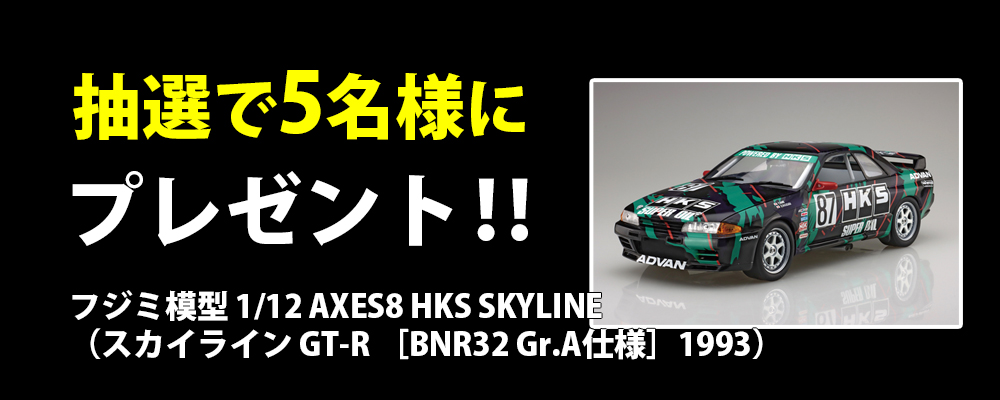 更に抽選で、フジミ模型 1/12AXES8 HKS SKYLINE(スカイライン GT-R (BNR32 Gr.A仕様)1993)を5名様にプレゼント、またはHKSオリジナル ツールボックス+ビクトリノックスセットを20名様にプレゼント致します。