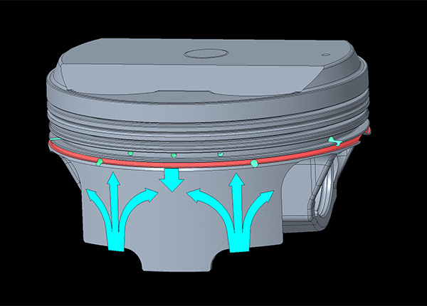 - A groove positioned below the oil-ring land supplies oil to the skirt as the piston begins its upward stroke. Multiple drain holes are added to the bottom of the oil-ring groove to release excess oil, while the oil-reservoir holes are placed toward the ends to maintain proper oil volume.