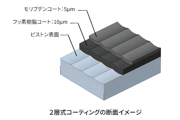 - 「2層式コーティング」を採用しています。外側の層は高荷重時の摺動に効果的なモリブデンコートを施し、内側の層は高回転時の摺動に効果的なフッ素樹脂コートを施工しております。