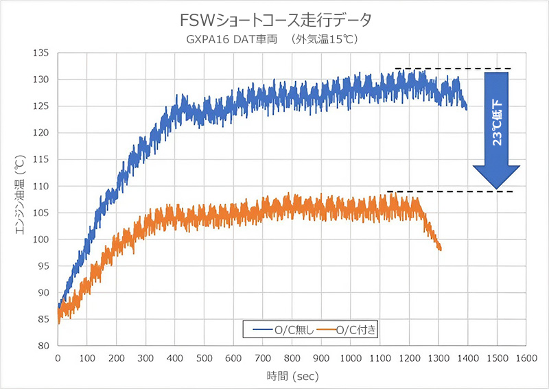 - FSWショートコーステストにて油温上昇を132℃ → 109℃まで抑えることが出来ました。