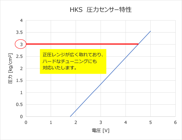 • 本キットの圧力センサーは正圧レンジを広くとっており、最大値は純正比で約6倍の「最大値  294kPa(3kg/cm²) 」まで正確な認識が可能となります。