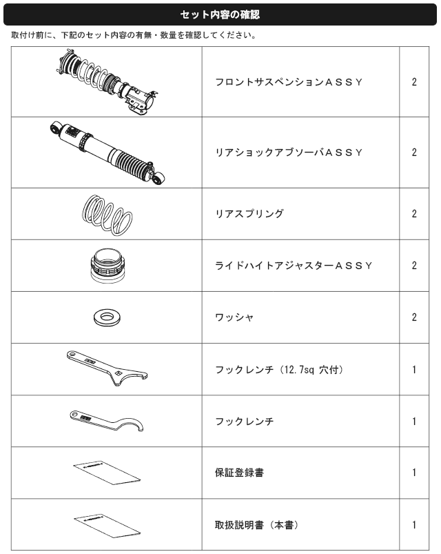 なお、出荷時車高から極端に車高を下げて使用することによるダンパーオイル漏れ等の不具合に関しても保証対象外となりますので、御注意ください。)