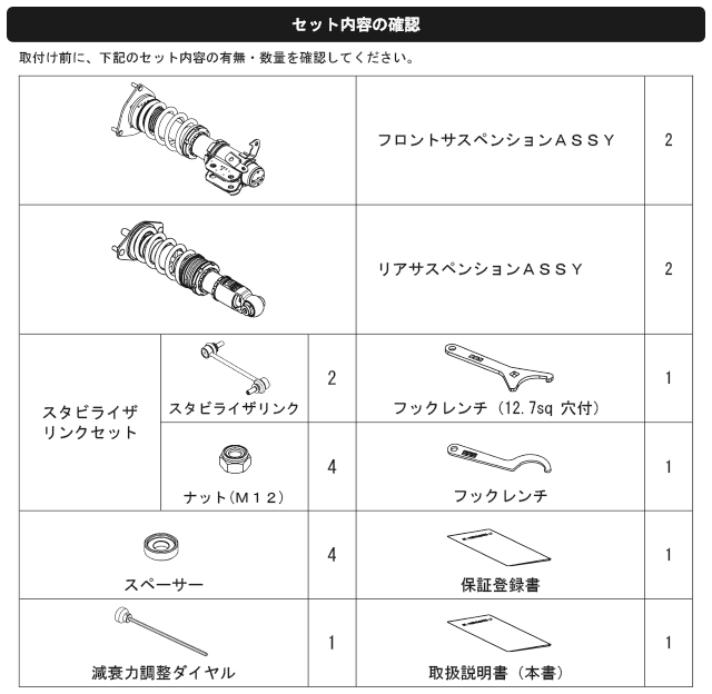 なお、出荷時車高から極端に車高を下げて使用することによるダンパーオイル漏れ等の不具合に関しても保証対象外となりますので、御注意ください。)