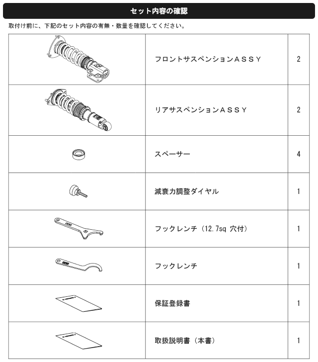 なお、出荷時車高から極端に車高を下げて使用することによるダンパーオイル漏れ等の不具合に関しても保証対象外となりますので、御注意ください。)