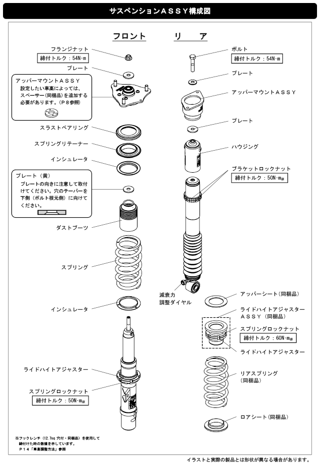 ・フロント車高調整幅に関して、出荷時状態では(-30mm~-43mm)の範囲、付属スペーサー使用により(-18mm~-31mm)の範囲で調整が可能です。