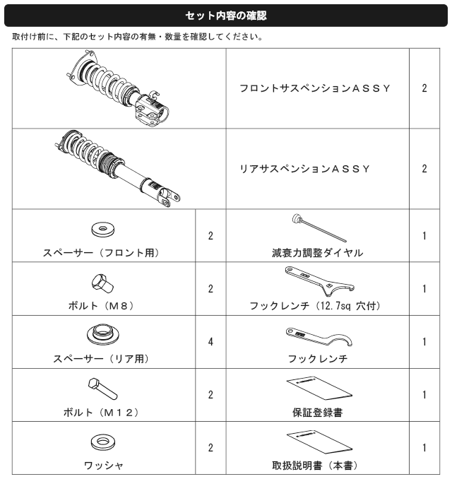 なお、出荷時車高から極端に車高を下げて使用することによるダンパーオイル漏れ等の不具合に関しても保証対象外となりますので、御注意ください。)