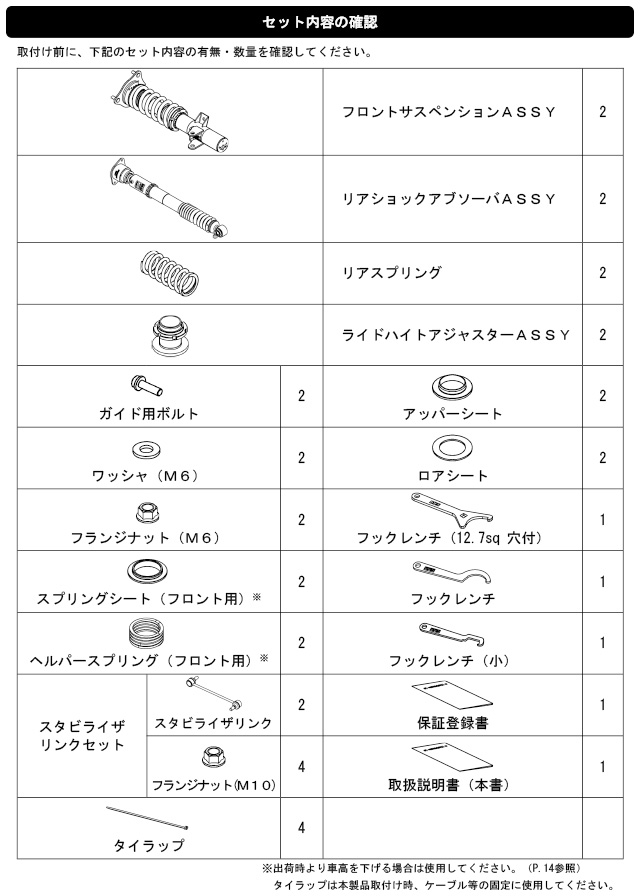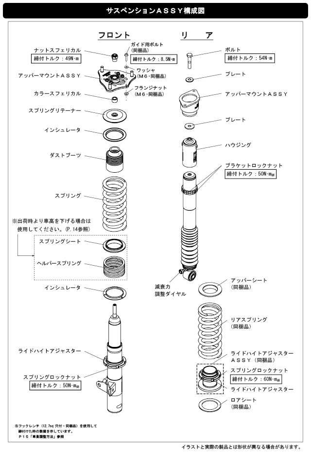 * 車高を-16mm以下に下げられる場合は同梱品のヘルパースプリングを装着してください。また、ヘルパースプリングを装着される場合、純正ホイールではハンドルロック付近でタイヤとサスペンションと干渉する恐れがあります。ホイールのオフセットやリム幅にご注意の上装着してください。