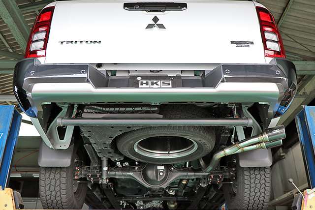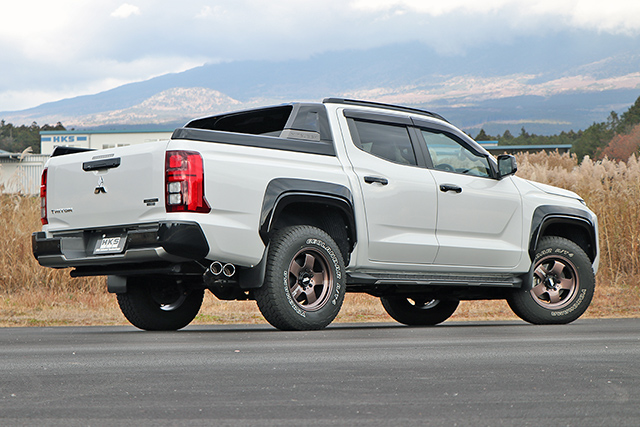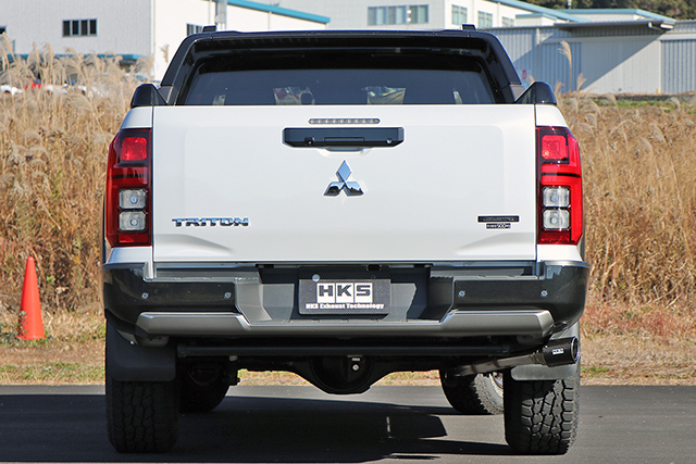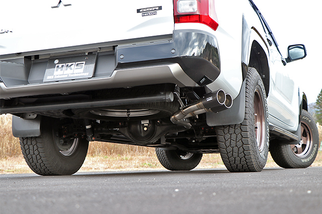 ピックアップトラック本来の使命である「荷台の使い勝手」を損なわないため、右リアタイヤ後方からのサイド出しを採用。