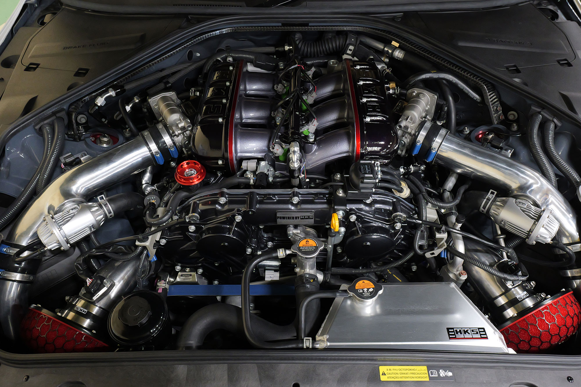 心臓部となるのは、レースエンジン同等の精度で組み上げられたCOMPLETE ENGINE VR38 4.3L STEP PRO+である。HKS Racing Suction+Super Power Flowインテークから吸気し、GT5565_BBツインターボとGTⅡウェイストゲート、SUPER SQV IVが一体となって、レスポンスと伸びを両立した過給特性を生み出す。専用設計2Stage Exhaust System R35 THE HKS specは、背圧とサウンドを緻密にコントロールしつつ、そのポテンシャルを解き放つ。